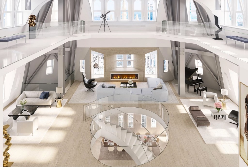 Details include 125 windows, 24-foot ceilings, a private elevator — and a 408-square-foot observatory terrace. The buyer will also have access to the building’s amenities, which include a gym, a lounge, a pool, a wine cellar and tasting room and a bike room.